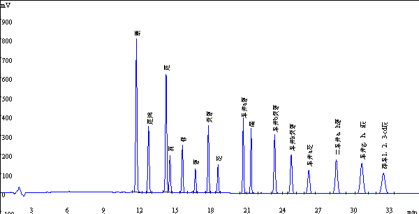 16种多环飘香烃标准化品高效液相色谱图有以下: