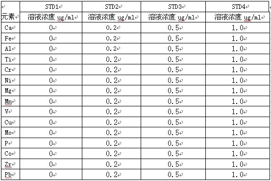 原辅料处理:称取0.5000g坯料置放100mL烧杯里,加5mL盐酸、2~3mL盐酸,置放电热器板里加温消融,插足5ml高氯酸,加温至起烟,拿下制冷,插足20mL水,加温消融无机化合物。制冷,移入100mL体积瓶中,加水萃取至刻度盘,混匀。试液中若有无定形碳物、硅酸等积累物沉淀,须干活性炭过滤。