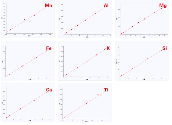 利用EDX 6000C能量色散荧光光谱仪丈量差别含量石墨或石墨矿国度标样物资 ZBM 150~ ZBM 154,成立Mg、Al、Si、K、Ca、Ti、Mn、Fe元素含量与强度的校订任务曲线。由图可知,石墨或石墨矿中存眷元素的含量与强度具备很是好的线性干系。