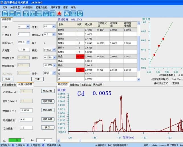 于分子推送光谱仪仪 228.8 nm 处,支配氛围营造-乙炔贫燃燃烧,以水调零,侧量试液的吸光度,减去伴同试料的缺员试试水溶液的吸光度,从主线任务曲线上直播杳出反应的镉盐浓度。