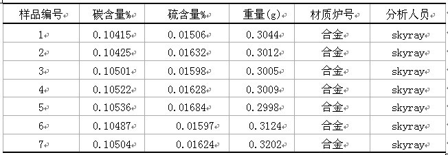 一碳素钢新国标GBW(E)010136-9901(C%:0.104,S%:0.015)用中频红外碳硫仪168型公测工作成果以内: